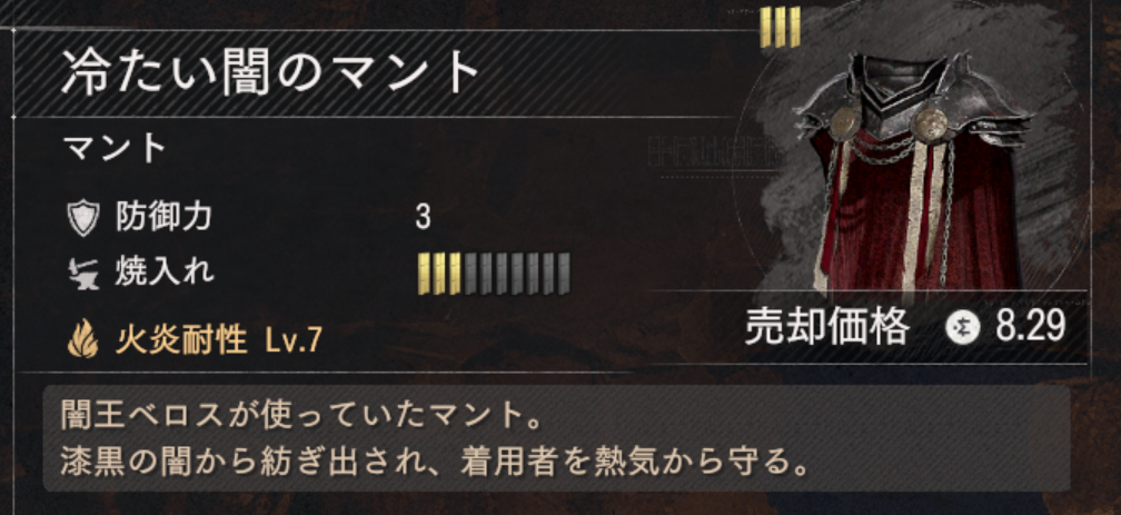 後は、氷の後はクリムゾンデザートとかの火のエリアが続くから、冷たい闇のマントはありがたい。破格の装備。